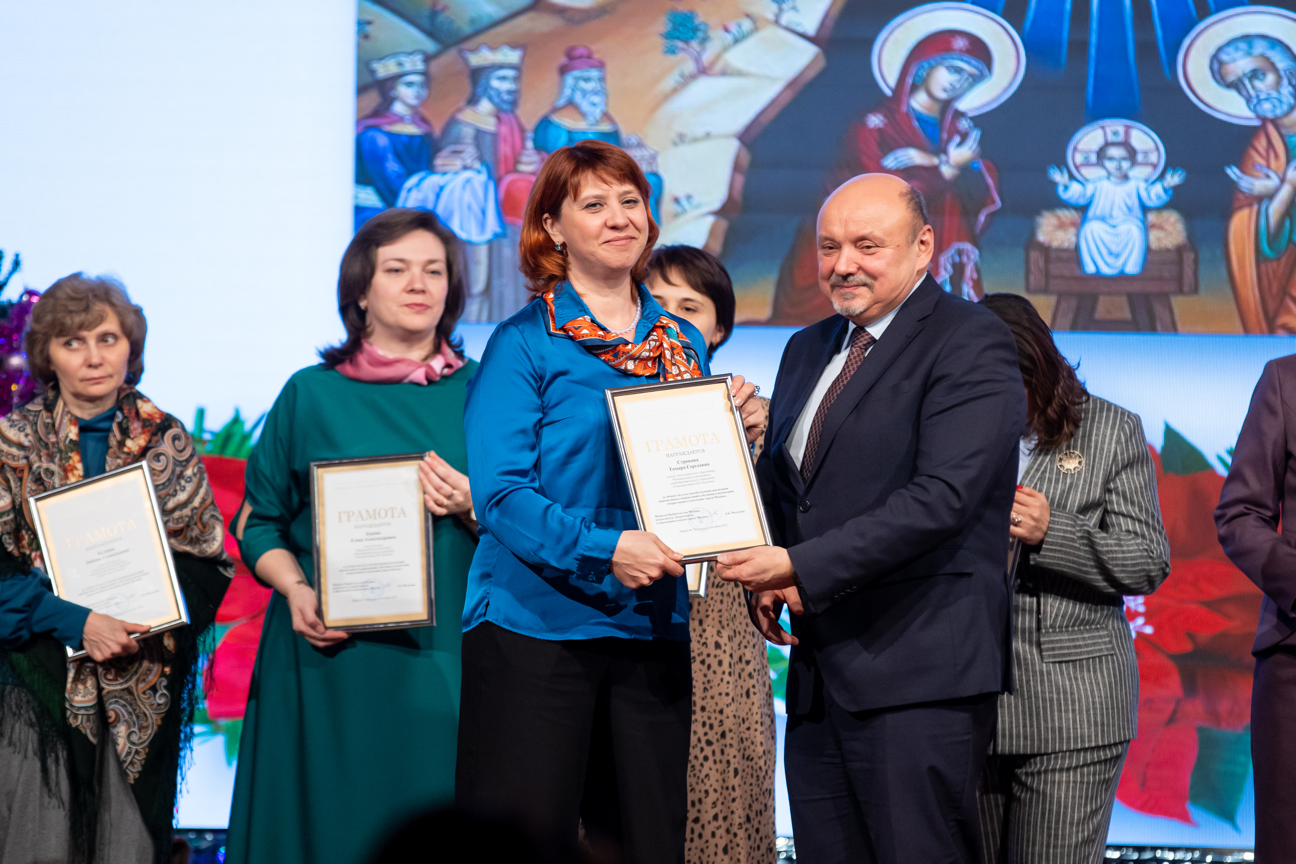 По очереди на сцену пригласили 11 педагогов, которые из рук главы получили грамоты Департамента образования и науки. Софья Миронова, одна из награждённых, 6 лет работает в Гимназии им. Пушкова: преподаёт биологию и химию. К урокам она всегда ищет творческий подход. «Я стараюсь прислушиваться к детям, даю им разнообразные задания, вместе мы ставим эксперименты… В общем, делаю всё, чтобы им не было скучно на моих уроках, – сказала педагог. – И, конечно, не забываю о морально-нравственном воспитании моих учеников: рассказываю о жизни великих людей – химиков и биологов».
