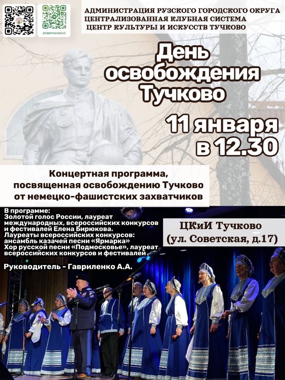 В 12.30 в Тучковском центре культуры и искусств пройдет концерт. В нем примут участие лауреат международных и всероссийских конкурсов и фестивалей Елена Бирюкова; лауреаты всероссийских конкурсов: ансамбль казачьей песни «Ярмарка», хор русской песни «Подмосковье».