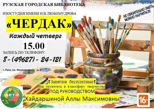 В Рузской городской библиотеке 30 мая в 15 часов состоится занятие в изостудии имени Н.В. Любомудрова «Чердак» под руководством А.М. Хайдаршиной.